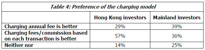 更多香港基金投資者更喜歡基於佣金的模式,而以收費為基礎的模式,57%表示這樣。內地投資者的意見不一,選擇收費模式的比例略高。(表4)